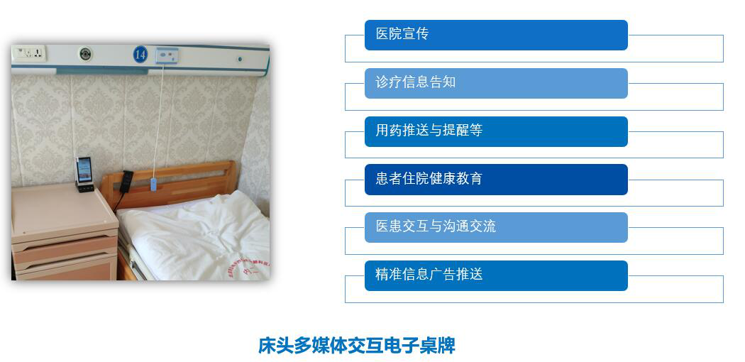 拓展床旁醫(yī)護(hù)、營養(yǎng)點餐、患者貼心服務(wù)、醫(yī)患交流、住院宣教、健康指導(dǎo)等功能,改善住院服務(wù)流程,改善患者就醫(yī)體驗,優(yōu)化醫(yī)患交互,改善醫(yī)療服務(wù)模式,提升智慧醫(yī)療的效率和水平。